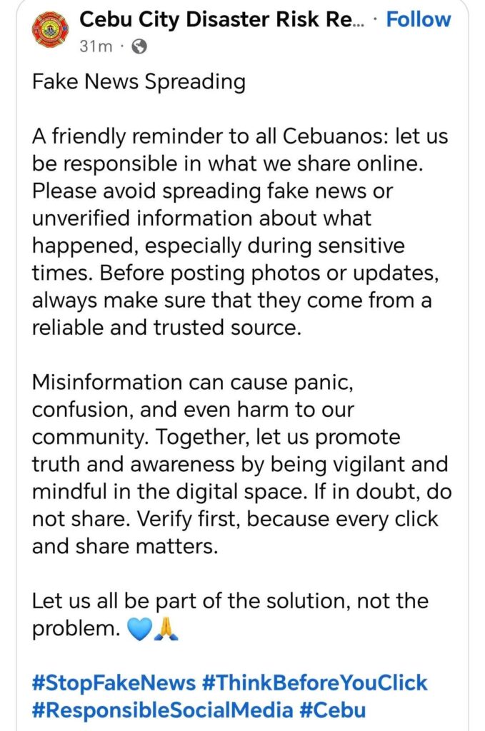 Check with PHIVOLCS, PAGASA, local LGUs, or reputable news outlets like Cebu Daily News, SunStar, and GMA News before posting disaster updates.