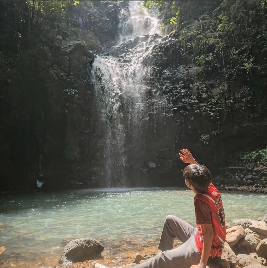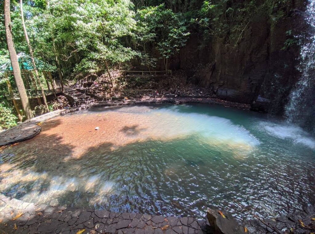 The falls feature two distinct cascades that are surrounded by towering trees and vibrant flora. The clear waters flow into natural pools inviting visitors to swim or relax by the water’s edge. The area is also home to white monkeys adding a touch of wildlife to the picturesque setting.
