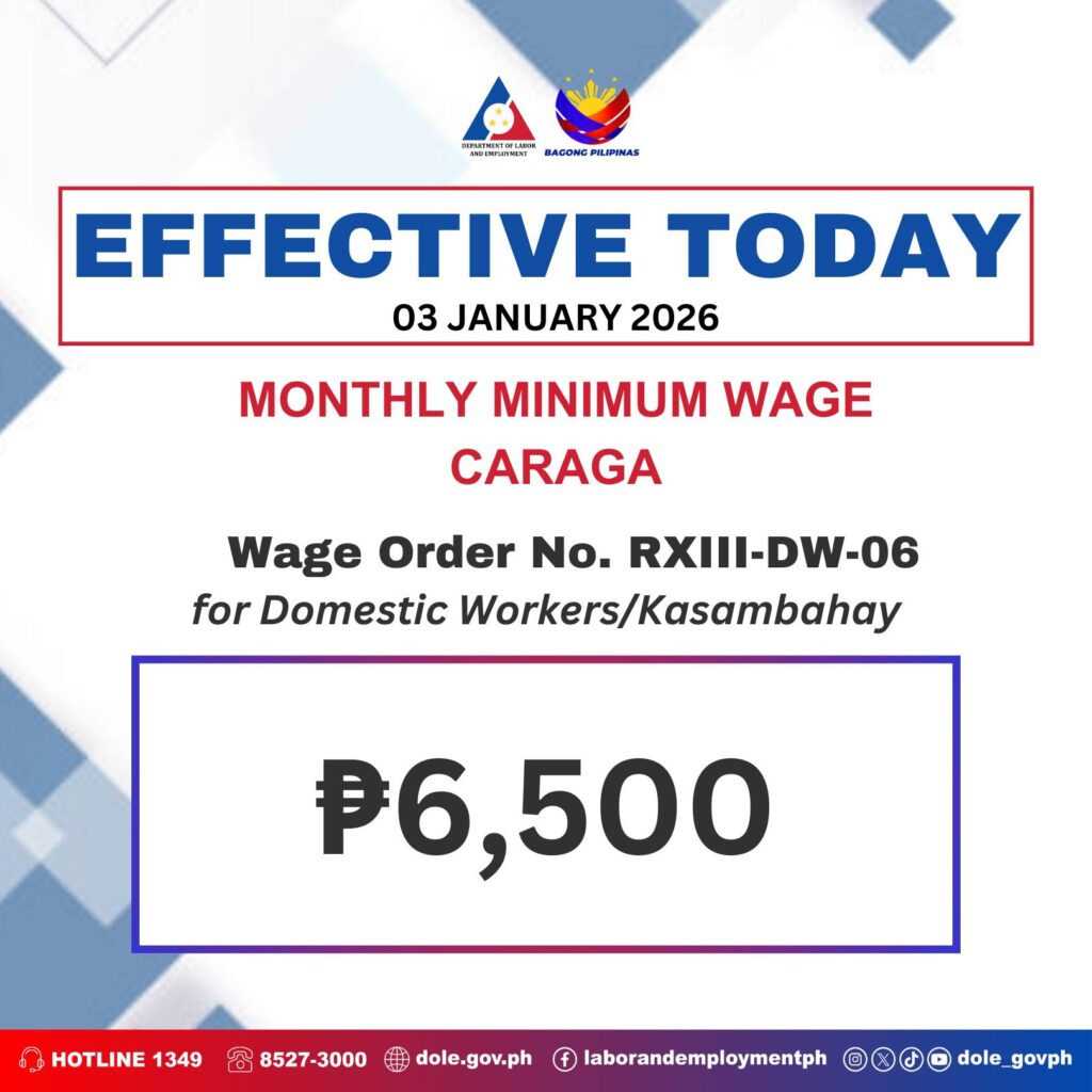 Domestic workers in Caraga receive a separate increase under RXIII-DW-06. The monthly minimum moves from ₱6,000 to ₱6,500 effective January 3, 2026. The adjustment targets basic needs support amid rising household costs.